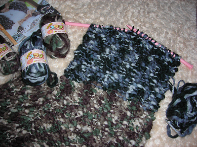 私は黒系と茶系のボーダー柄でマフラーを編んでいます。