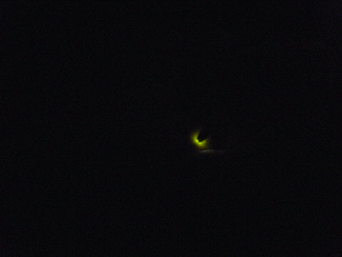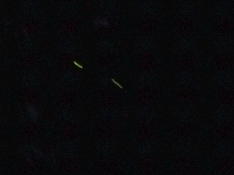 樹の生い茂った池の脇道あちこちに、ホタルの光が舞っているの。