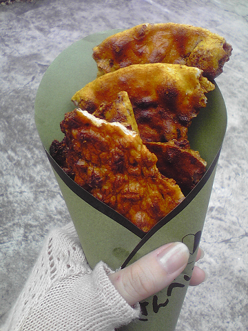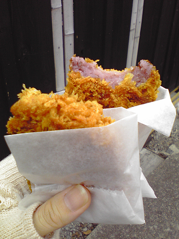 お寺巡りの道すがら売店で買って食べた、紫芋コロッケに焦げせんべい。