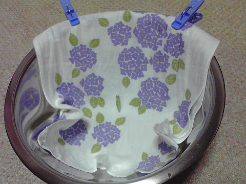 容器に布を垂らして、洗濯バサミなどでとめ、