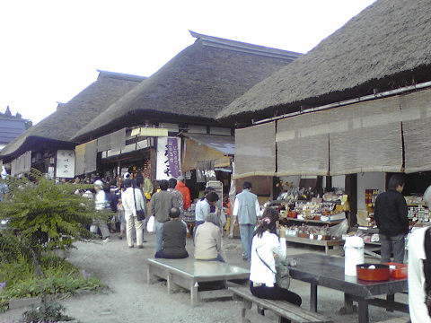 江戸の面影を残す藁葺き屋根のみやげ物屋が立ち並びます。