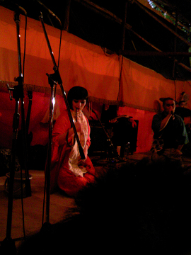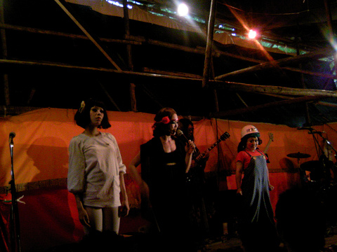 即席の小屋の中で、サーカスのような風貌の人達が
