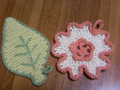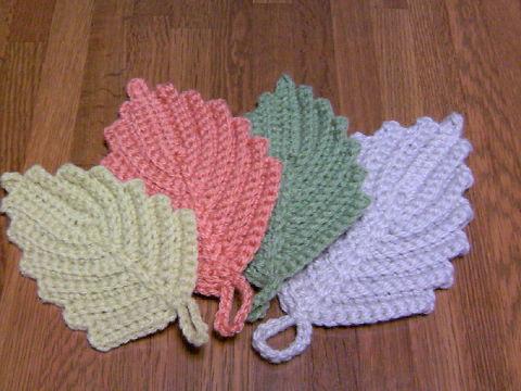 桜と葉っぱの形で、アクリルたわしを編みました☆