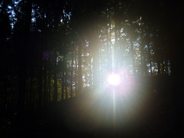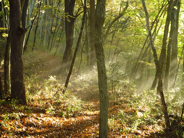 朝靄に木漏れ日が差して、光の筋ができてました。